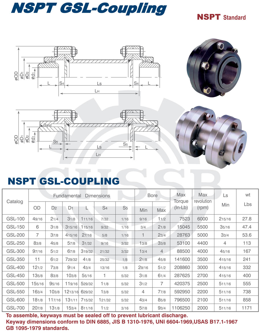 產(chǎn)品范圍: 美標/歐標:(GSL) 英制尺寸產(chǎn)品(適用于美標市場) 公制尺寸產(chǎn)品(適用于歐標市場) GSL型聯(lián)軸器